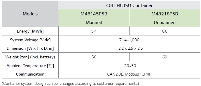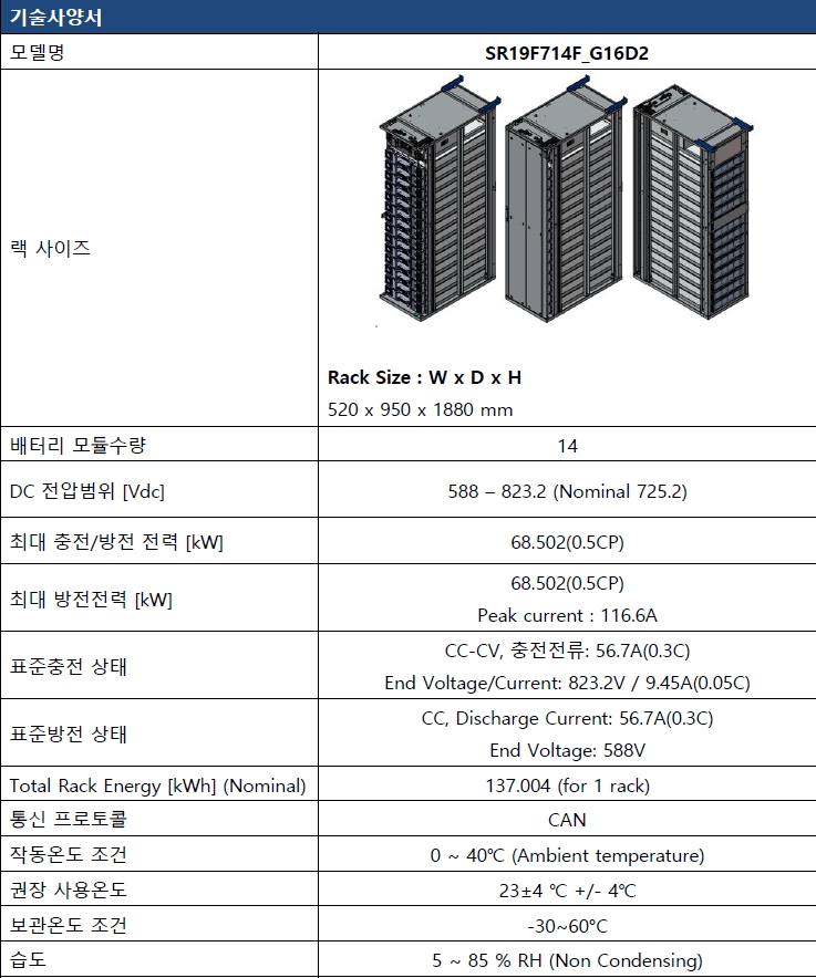 LG화학 제품으로 랙 모델 'SR19G714_G16D2' 137kWh x 2 대 를 적용.